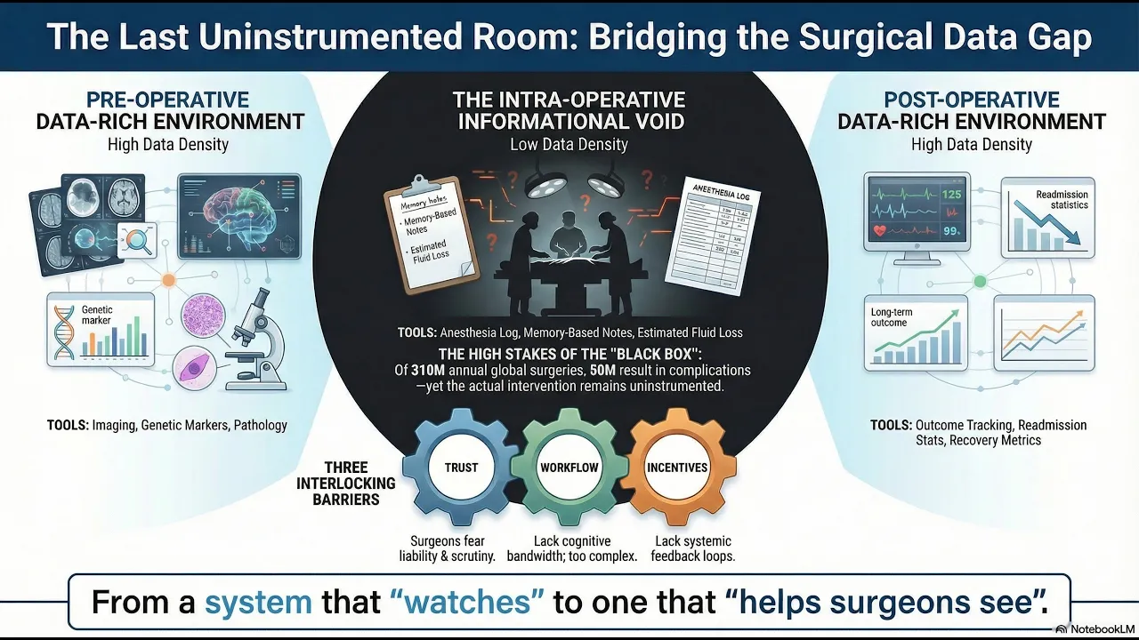 These trends do not tell you what to build. They tell you that something will be built. The operating room will not remain uninstrumented indefinitely. The question is not whether this gap closes, but how and whether it closes in a way that serves surgeons and patients, or in a way that is imposed upon them by institutions optimizing for compliance rather than care.